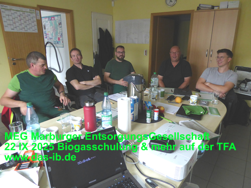 28. I. 2025 Biogas Seminar bei uns - aus der Praxis für die Praxis sowie aus aktuellen Versicherungsschäden (Bräne DMGS, BHKWs, Aktivkohle (AK) sowie Mini - Explosionen) lernen Zu unseren Seminaren am technischen Sitz: Was bekommen Sie für die 250 € netto Teilnehmergebühr? Neben den 360 Minuten praktischen Inhalten - gerne mit praktischen Versuchen in der Halle mit / an unseren mobilen Fackeln - Ergebnissen unseres 1-Jährigen Versuches: Wassestoff in Biogas / Deponiegas einmischen und in den echten Doppelmembrangassichern (DMGS ca. 7 m Hoch bzw. 7 m Lang) speichern sowie der Möglichkeit zur Teilnahme am Biogasssicherheitsführerschein im Anschluß (d.h. Prüfung zu 75 € netto): Kaffee, Tee, Frühstück (belegte Brötchen), Nachmittgaskuchen in mind. Bioland - Qualität, gibt es Punsch, Heiß- und Kaltgetränke und zum Mittag "Italian-Fast Food". Ihre Anmeldung senden Sie gerne per Fax oder email. Die bezahlte Rechnung ist Ihre Anmeldebestätigung. TeilnehmerInnen ca. 10 Personen pro Tag. Ausgangs-Rechnungen bei uns per Post in Papier für Sie 21. und 22. Januar 2025 in Göttingen Biogas - TFA - Schulungen beim as-nds (Abfallzweckverband Südniedersachsen) und GEB (Göttinger Entsorgungsbetriebe) sowie Teilnehmer der GBAB (Gesellschaft für Bioabfallwirtschaft in Landkreis und Stadt Aschaffenburg mbH) |