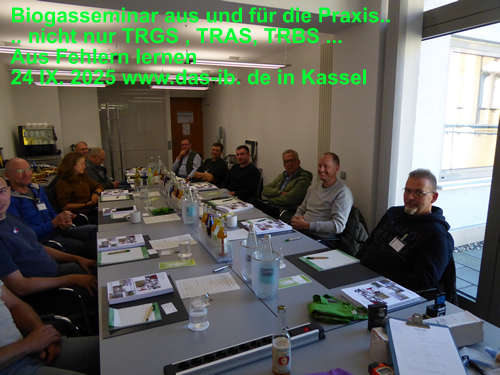 24. IX. 2025 in Kassel Klär- / Biogasseminar - schulung aus der Praxis für die Praxis und nicht nur DWA / DVGW / FvB - TRGSen, TRASen und TRBSen - aus Fehlern & Schäden lernen Deponiegas nach § 4 DepV und mehr ...ua am 23. IX. 2025 in Kassel 22. IX. 2025 Geschlossene Biogas TFA - Schulung - Inhausveranstaltung bei der Marburger Entsorgungs-GmbH (MEG), 35039 Marburg - direkt auf der Anlage für das Betriebspesonal mit dem RPA Gießen. 3.IX. 2025 Deponiegassemnar nach § 4 Deponieverodnung DepV Nr. 3 beim ALL (Abfallwirtschaftsbetrieb des Landkreis Leer) auf der Deponie Breinermoor 30. IV 2025 Deponie - und Biogasschulung (geschlossene Veranstaltung) bei der KAVG am Standort Pohlsche Heide von der TFA über MBA bis Deponiegasnutzung und zukünftiger Deponiegasnutzungen mit Biogasen aus der MBA und TFA Energiekonzepte - Ideen und Umsetzungen im Schulungsverbund West der DAS - IB GmbH - Vom Praktiker für PrakterInnen: Rückblick zu den Sicherheitstechnsichen Prüfungen an den Vortagen, Begehung von unterirdischen Bauwerken (Beispiel ua Todter beim AWVC), ATEX & Ex-Zonen, primärer Explosionsschutz, Gasdichtigkeiten - UEG - ppm, Geeignete Meßgeräte: PSA, Dichtheit , Aktuelle Schadenfälle z.B. Brand in BHKW - Gebäuden, AK-Brand 23. IV. 2025 WEV Zentraldeponie Cröbern (ZDC) - geschlossene Beratung & Schulung: Anwendung um Umsetzung der 12. BImSchV (Störfallrecht - untere Klasse insb. §§ 3 bis 8 und 16) für den Bau & Betrieb der Gasanlagen mit Deponiegas- und Biogas-Gasspeichern: Trockenfermentationsanlage (TFA nach dem Sysetm Herhof - KEA - Kompost- und Energie -Anlage), MBA und Deponiegasanlage. Einordnung der Erkenntnisquelle TRAS 120 in diesem Zusammenhang, Westsächsische Entsorgungs- und Verwertungsgesellschaft mbH, 04463 Großpösna